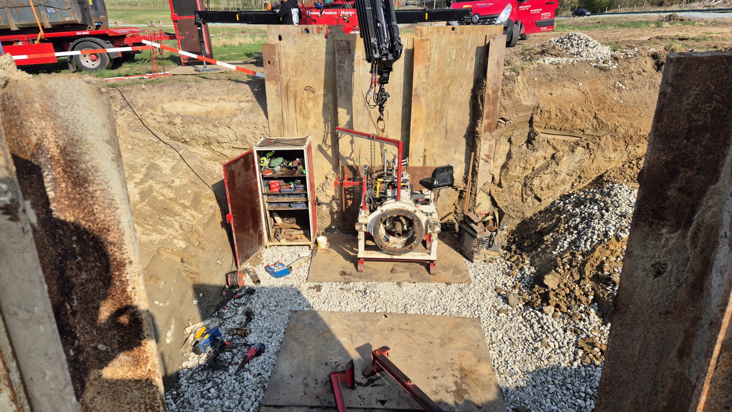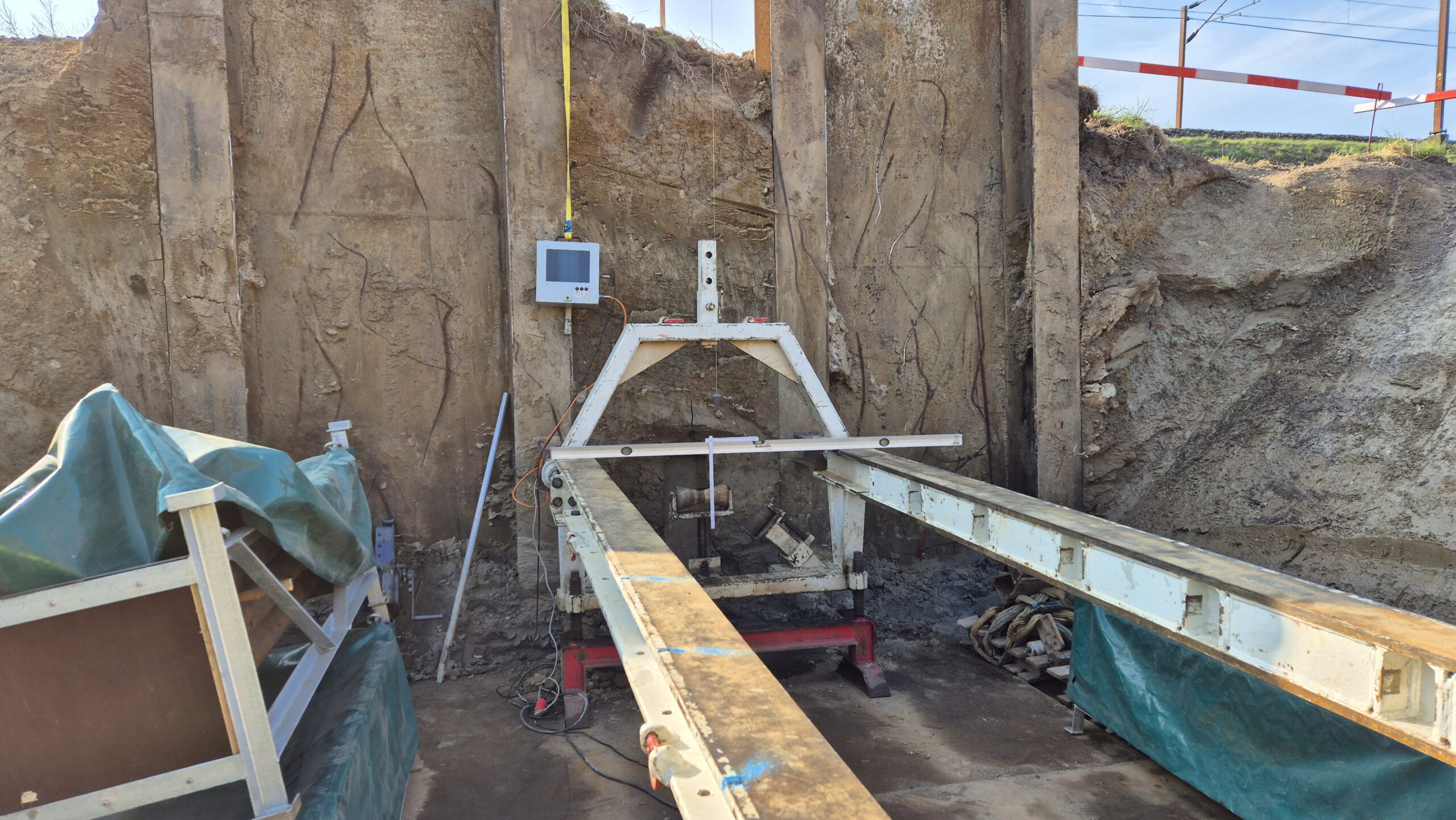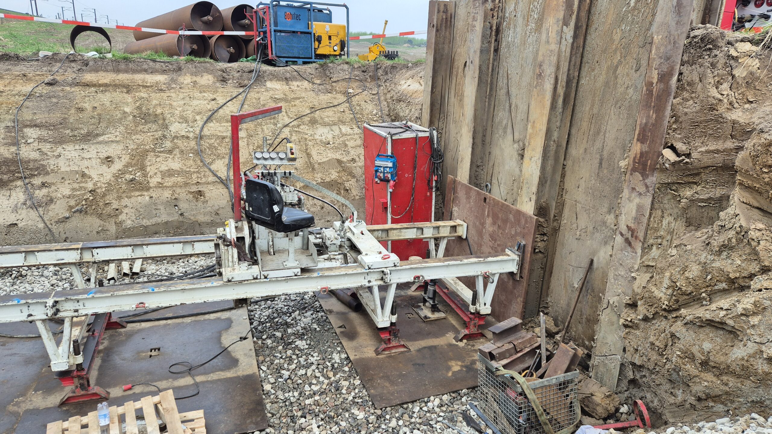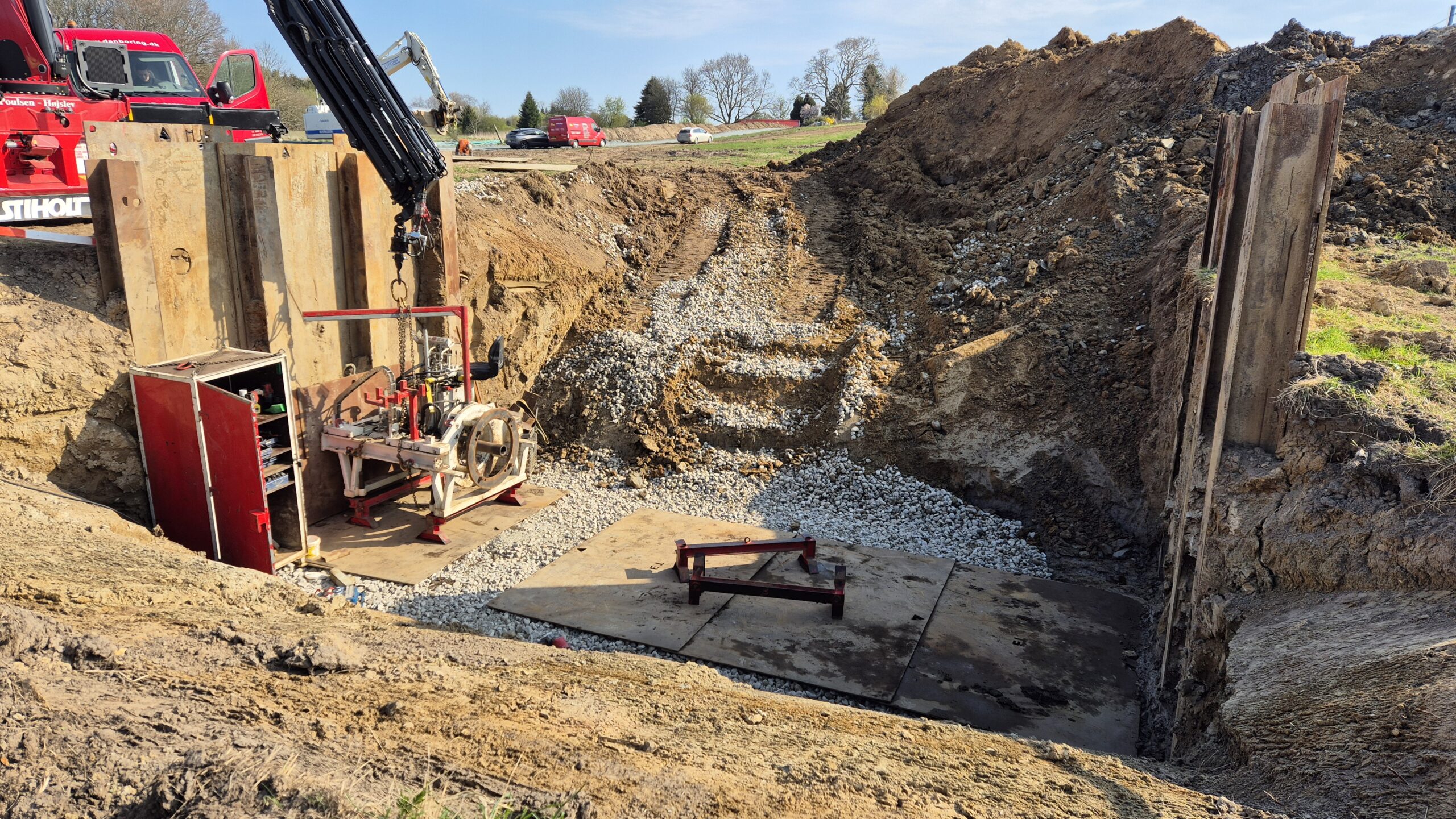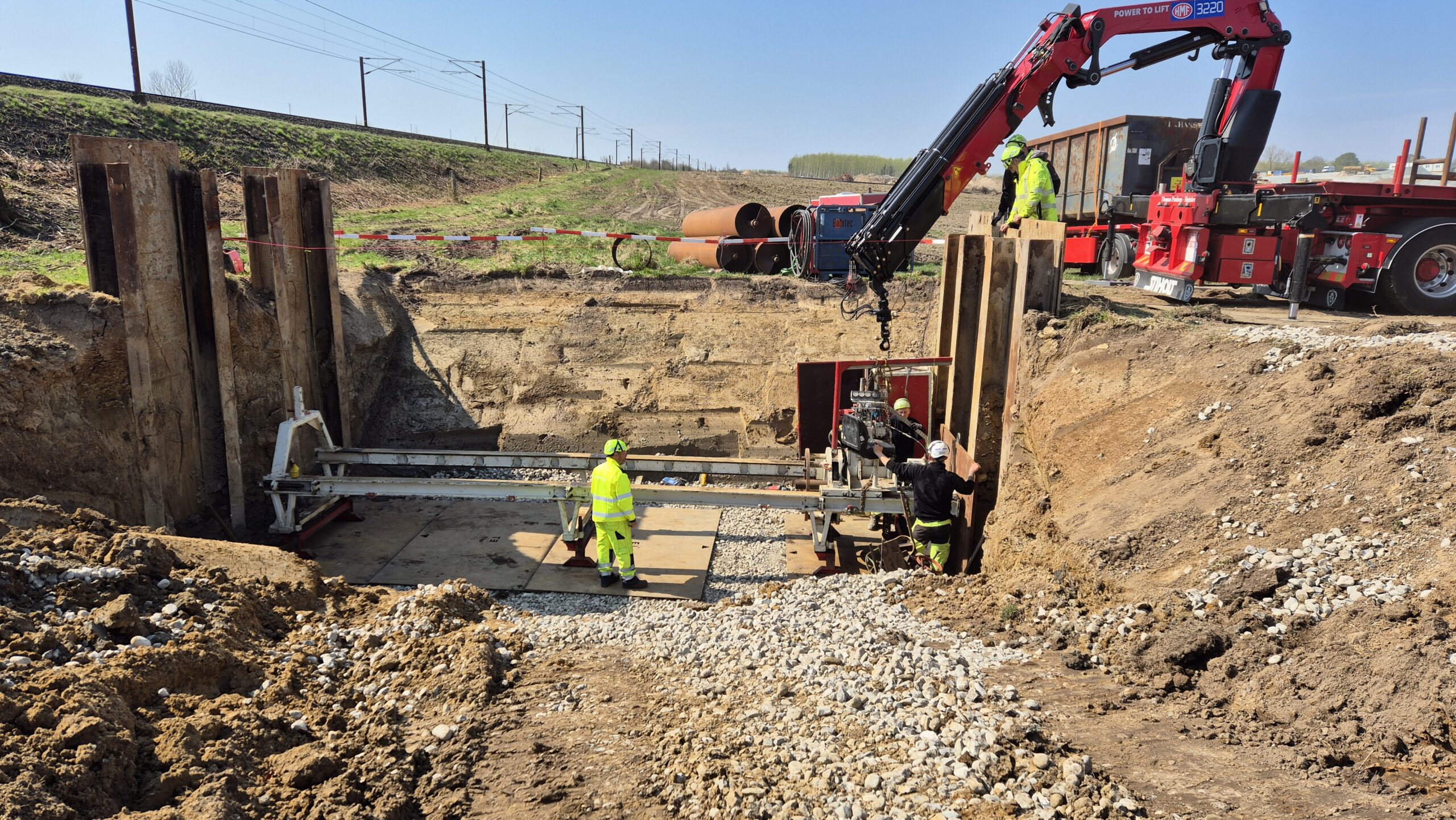 Pilotrørsboring under de 2 gamle jernbanespor vest for Odense. Rørledningen bores med 5‰ fald og skal forbinde et vandløb. MJ Eriksson A/S har gravet ud og etableret københavnerspuns i byggegruben. Danboring leverer stålrør, mandskab og en perfekt udført pilotboring.